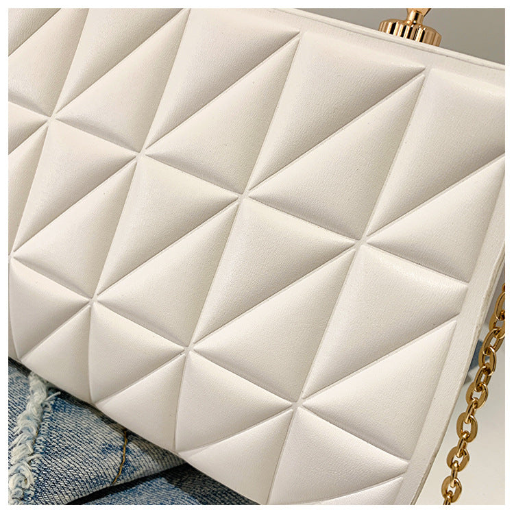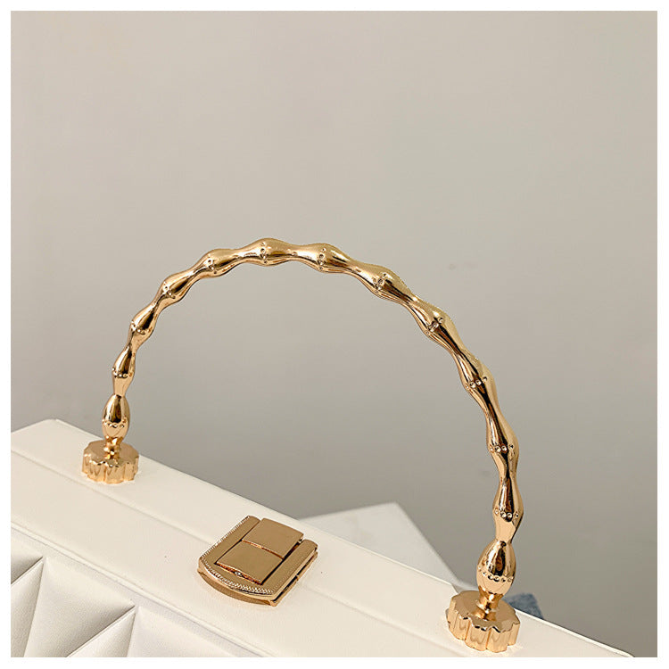 Meet your new event essential. The Handle That 3D-Quilted Box Clutch combines modern geometry with timeless glam. A sculpted hard-case silhouette is wrapped in soft vegan leather and finished with a statement gold bamboo top handle. Wear it two ways: carry by the handle for a classic look or clip on the detachable gold chain to go hands-free. The secure push-lock closure keeps your valuables safe while the structured shape stays crisp from ceremony to dance floor. Perfect for brides, bridesmaids and guests alike—and for any night you want your bag to do the talking.